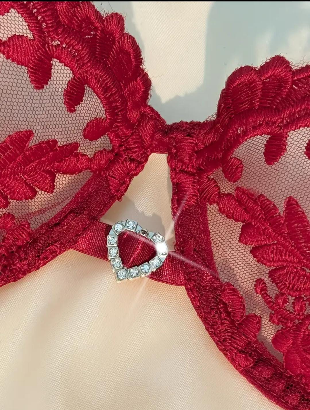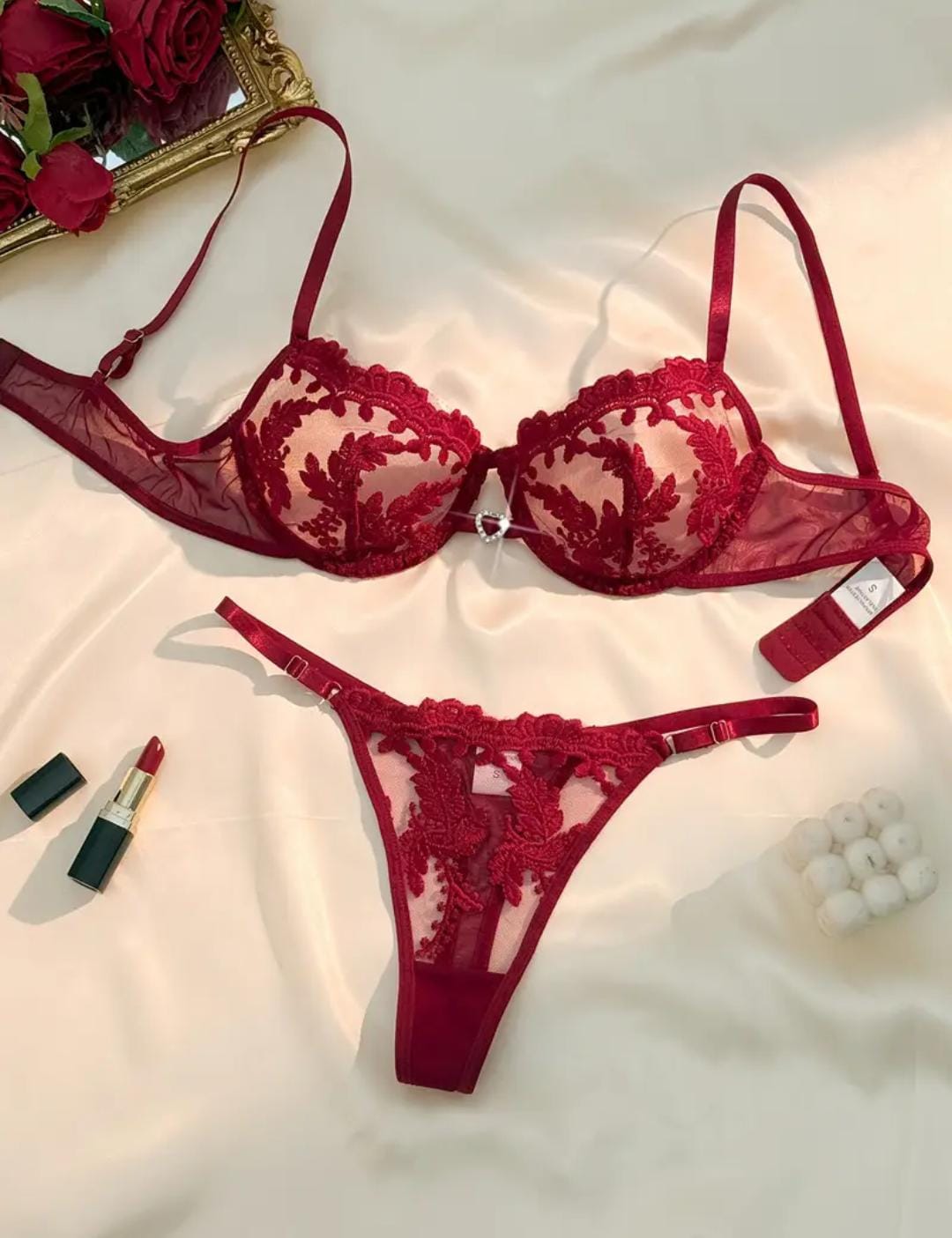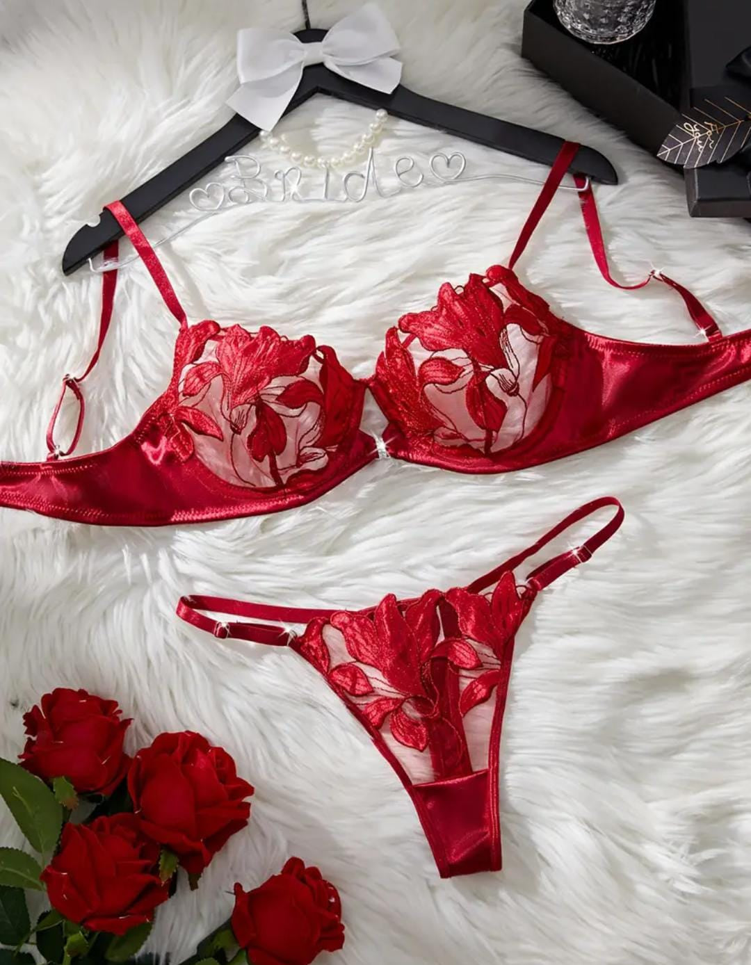 Conquista cada mirada con Rubí Tentación, un conjunto diseñado para reinar en la intimidad. Su encaje escarlata abraza cada curva mientras el corazón de cristal al centro del busto susurra promesas de placer.