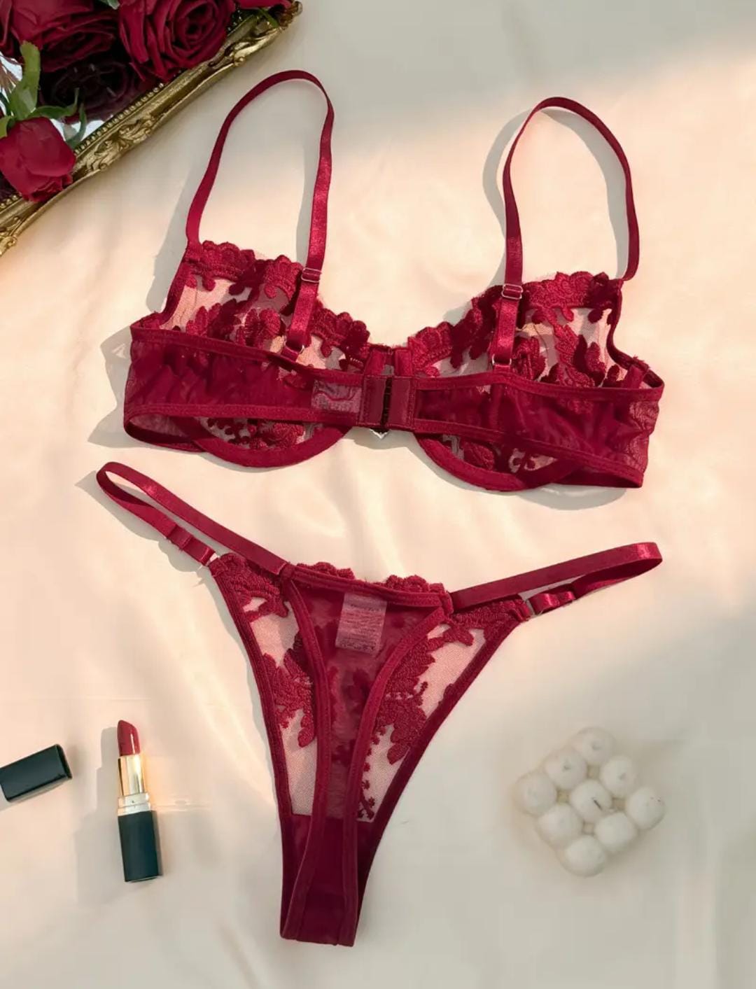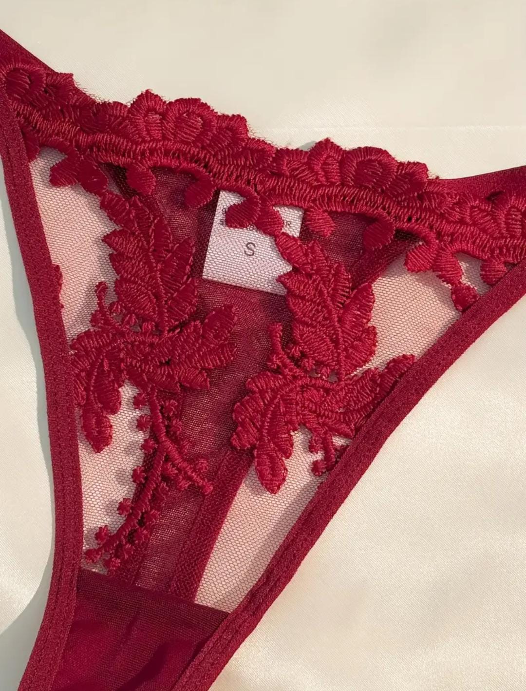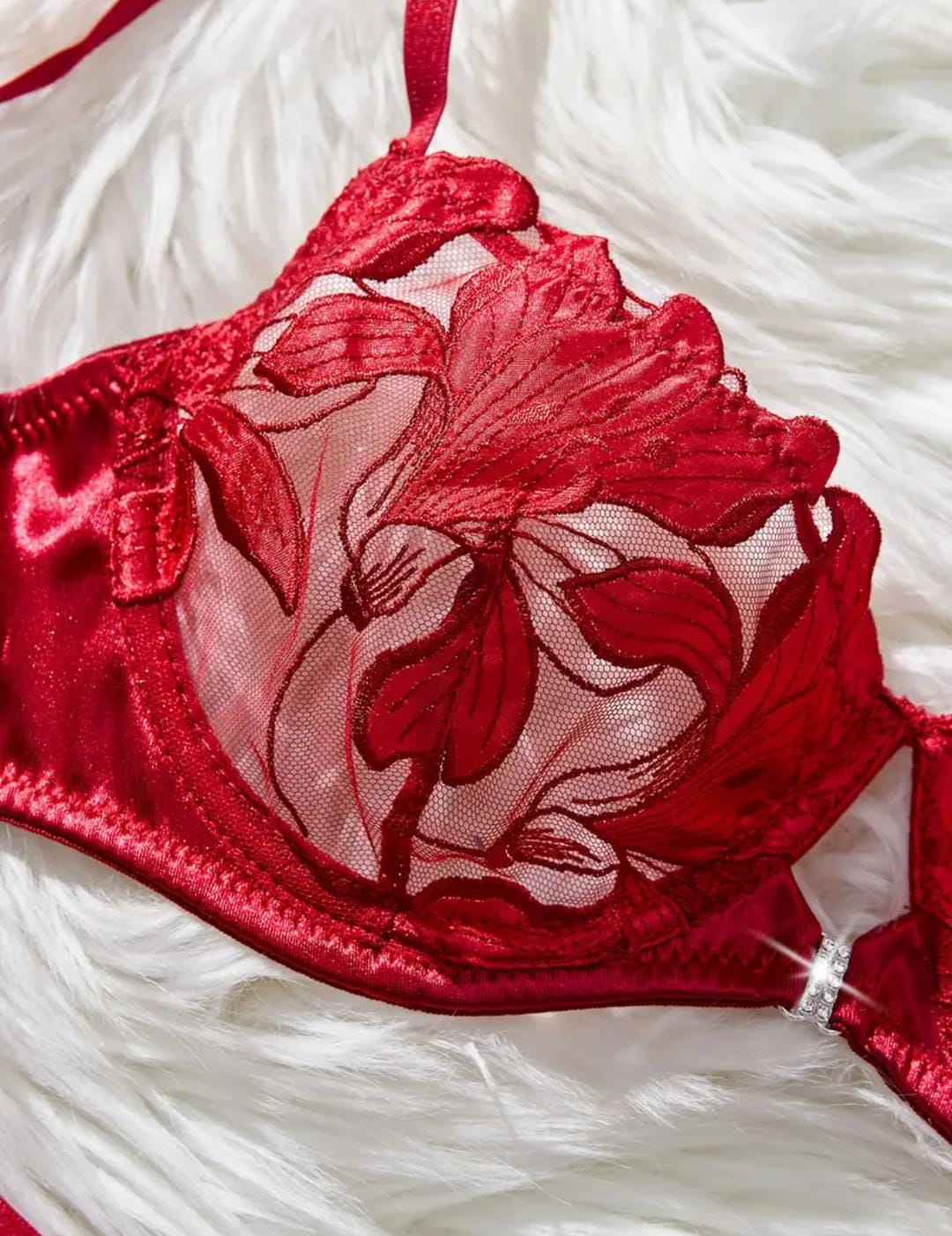 Conquista cada mirada con Rubí Tentación, un conjunto diseñado para reinar en la intimidad. Su encaje escarlata abraza cada curva mientras el corazón de cristal al centro del busto susurra promesas de placer.